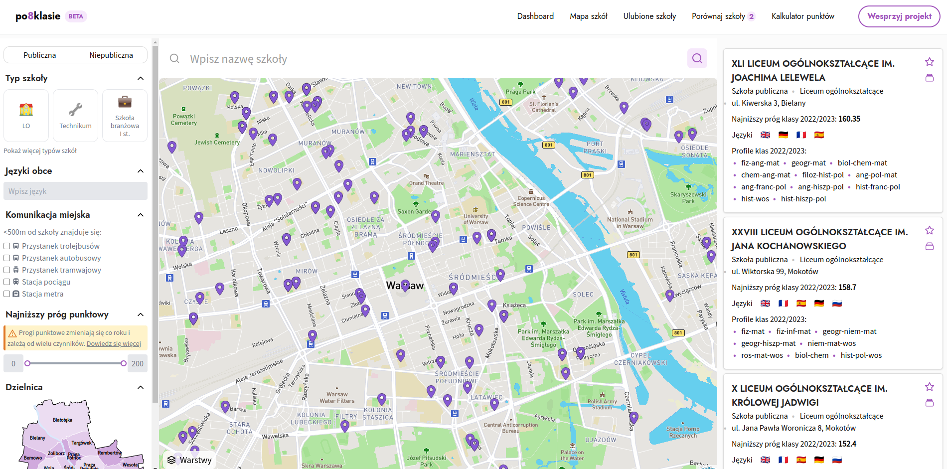 po8klasie.pl is an open-source lookup service designed exclusively for searching information about high-schools and vocational schools. Our goal is to empower students to make well-informed school choices beyond mere academic figures. By collating essential data and presenting it in a user-centric manner, we’re reshaping the decision-making process. Our project thrives on collaboration, partnering with local governments, schools, students, and parents to provide comprehensive insights that shape futures.